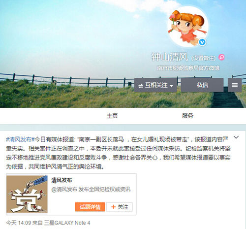 南京紀委:"副區(qū)長落馬在女兒婚禮現(xiàn)場被帶走"報道失實