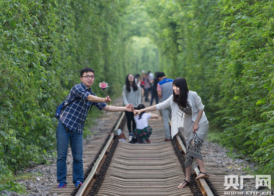 2015年05月10日,南京,隨著夏季的到來,去年在網(wǎng)絡(luò)走紅被網(wǎng)友們冠以“愛情隧道”美稱的南京市江寧區(qū)的一段鐵路,其兩旁大量的綠色植被再次枝繁葉茂,吸引了不少游客慕名前往。