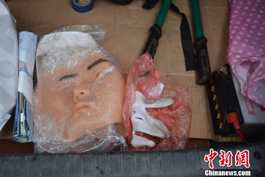 在查獲的作案車輛內(nèi),民警現(xiàn)場提取到口罩、假發(fā)、硅膠面具、電擊棍、匕首、手套、封口膠、約束帶、彈弓、望遠鏡、假牌照等大量作案工具。