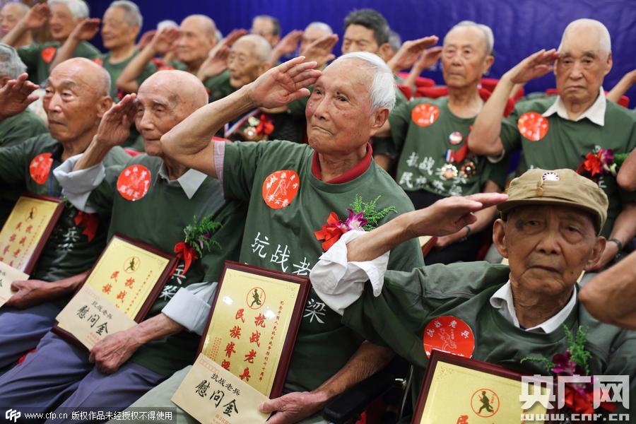 2015年7月5日,三十三位來自全國各地的抗戰(zhàn)老兵齊聚南京,參加南京1213志愿者同盟舉辦的2015紀(jì)念77抗戰(zhàn)78周年老兵重聚活動(dòng),他們中有參加過南京保衛(wèi)戰(zhàn)、淞滬會(huì)戰(zhàn)、武漢會(huì)戰(zhàn)、長(zhǎng)沙會(huì)戰(zhàn)、常衡會(huì)戰(zhàn)的前線將士,也有從事輜重、通信、醫(yī)護(hù)等工作的當(dāng)年老兵,共憶崢嶸歲月。
