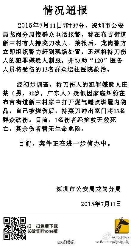 【深圳發(fā)生持菜刀砍人事件:致1死12傷】據(jù)深圳市公安局龍崗分局通報:今天上午,深圳布吉街道新三村有人持菜刀砍人,目前已致1死12傷。經(jīng)初步調(diào)查,嫌犯莊某(男,32歲,廣東人)疑因家庭糾紛在家中打開煤氣罐點燃屋內(nèi)物品,自己被燒傷后,持菜刀沖出家門將13名群眾砍傷。1人搶救無效死亡。案件正在進一步偵辦中。