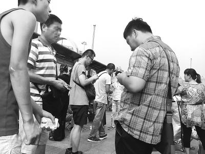 當天下午天氣炎熱,每個售票窗口前都有十幾位乘客頂著烈日排隊。在隊尾的人群中,有三四個男女手里各拿著一摞地鐵票,向排隊的人兜售。