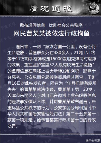 中新網(wǎng)8月17日電 據(jù)天津市公安局官方微博消息,近日一則“爆炸方圓1公里,沒有任何生命跡象,普通群眾死亡480余人”的虛假消息在網(wǎng)上大量流傳。經(jīng)調(diào)查,天津警方傳喚了網(wǎng)民曹某某(男,23歲,天津東麗區(qū)人),其對在微博上散布虛假信息供認(rèn)不諱,警方?jīng)Q定將曹某某依法行政拘留十日。