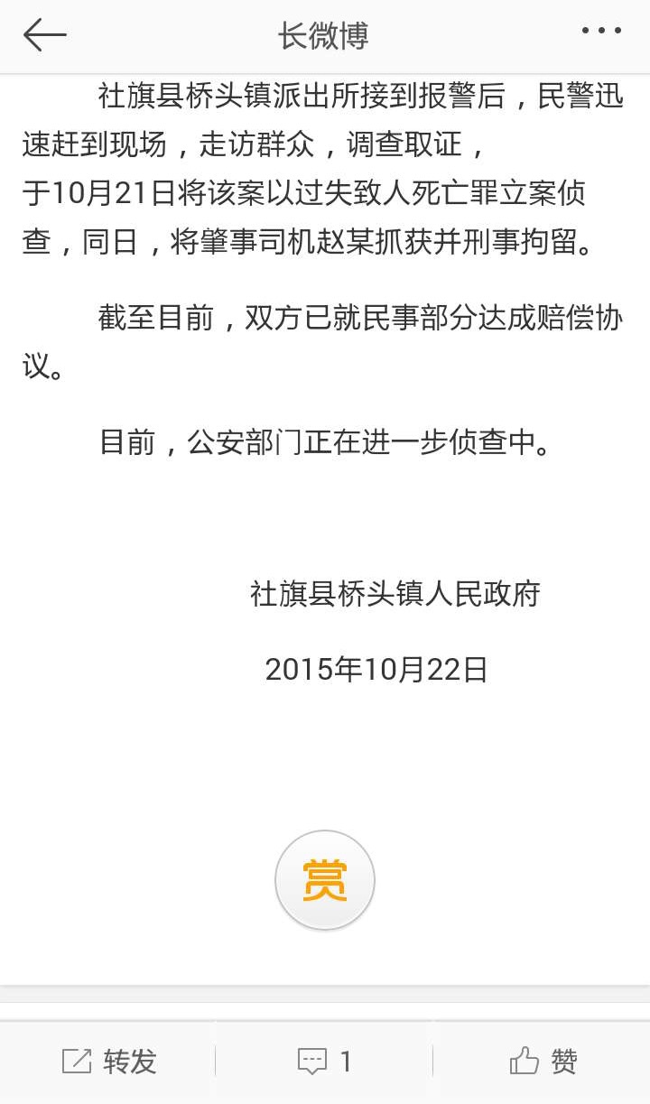 社旗官微發(fā)布的一篇情況說(shuō)明稱(chēng),20日下午,犯罪嫌疑人趙某駕駛挖掘機(jī)在倒車(chē)過(guò)程中,將拉著兩輪平板車(chē)路過(guò)的村民顏某撞到,并致受害人顏某當(dāng)場(chǎng)死亡。于10月20日將該案以過(guò)失致人死亡罪立案?jìng)刹,同日,將肇事司機(jī)趙某抓獲并刑事拘留。