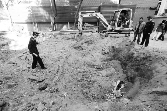 經(jīng)東城區(qū)城管現(xiàn)場勘測,院內(nèi)4間平房內(nèi)的地下空間,被挖最深處達2.1米,共計153平方米,此外,租戶還在院子里的空地上開挖了165平方米的深坑。