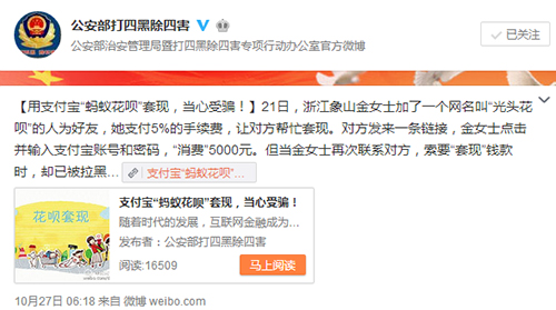 “螞蟻花唄”官方微博早在5月8日就發(fā)表聲明稱,將嚴(yán)打“套現(xiàn)”,違規(guī)商家將被封號或凍結(jié)賬戶資金。公安部打四黑除四害官微也在10月27日發(fā)布消息提醒網(wǎng)民,當(dāng)心受騙!