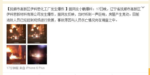 據(jù)沈陽晚報官方微博消息 【撫順市高新區(qū)伊科思化工廠發(fā)生爆炸 】據(jù)網(wǎng)友小鵬爆料:17日晚,遼寧省撫順市高新區(qū)伊科思新材料有限公司發(fā)生爆炸,據(jù)網(wǎng)友反映,當時聽到一聲巨響,房屋產(chǎn)生晃動。