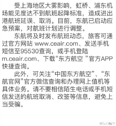 受上海地區(qū)大霧影響,虹橋、浦東機(jī)場能見度達(dá)不到航班起降標(biāo)準(zhǔn),造成進(jìn)出港航班延誤、取消。目前,東航已啟動應(yīng)急預(yù)案,對航班計(jì)劃進(jìn)行調(diào)整。