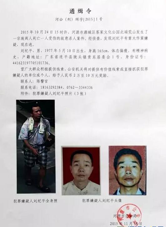 2015年11月19日,河源警方發(fā)布懸賞通告,對(duì)提供線索或直接抓獲疑犯劉紀(jì)平的單位或個(gè)人,將給予人民幣2萬(wàn)至10萬(wàn)元獎(jiǎng)勵(lì)。