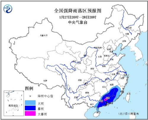 受南支槽和偏南暖濕氣流共同影響,預(yù)計(jì)27日20時(shí)至28日20時(shí),廣西東部、廣東、江西南部以及福建大部等地有大雨或暴雨,其中,廣東中北部的局部地區(qū)有大暴雨(100~120毫米);上述地區(qū)最大小時(shí)雨強(qiáng)可達(dá)20~30毫米。為此,中央氣象臺(tái)1月27日18時(shí)發(fā)布暴雨藍(lán)色預(yù)警。