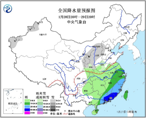 27日20時(shí)至28日20時(shí),新疆西部、西藏東部等地的部分地區(qū)有小到中雪或雨夾雪;江南中東部、華南中東部等地有中到大雨,其中,江西南部、福建西部、廣東等地的部分地區(qū)有暴雨,局地有大暴雨(100~120毫米)。黃海南部、南海東北部和東南部、東海大部海域?qū)⒂?~7級(jí)、陣風(fēng)8級(jí)風(fēng)。