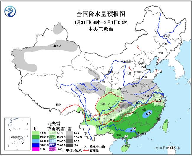 1月31日08時至2月1日08時,新疆北部和西南部、青海東部、陜西南部、甘肅南部、黃淮南部和西部、江淮、江漢、江南北部、貴州中北部等地有小到中雪或雨夾雪,局部有大雪;西南地區(qū)東部、云南東南部和北部、江南中南部、華南等地有小到中雨,其中,江西中部、廣西南部沿海和東北部、廣東西部等地的部分地區(qū)有大雨。臺灣海峽將有7~8級、陣風9~10級的大風。