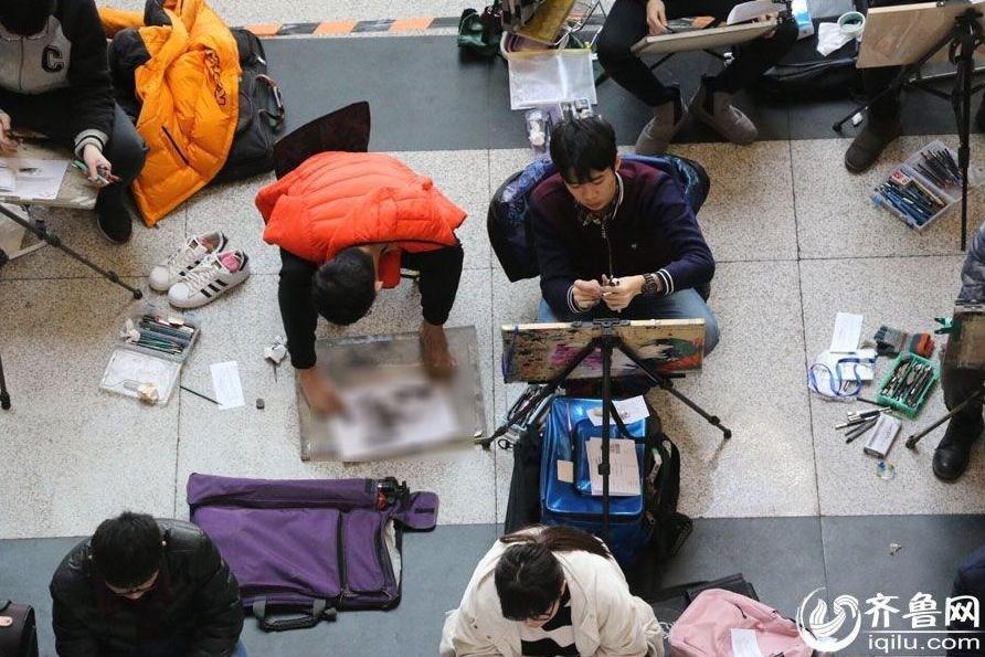2月16日,2016年山東省藝考?颊嚼_帷幕,在濟(jì)南舜耕國際會展中心美術(shù)類專業(yè)考場,一位用腳畫畫的學(xué)生引起了記者注意。與其他考生不同的是,他的畫板沒有放在支架上,而是直接放在考場大理石地面上,今天的最高氣溫只有8度,這位考生赤著雙腳完成了考試。圖為一位考生用腳畫畫。 白少光 攝 圖片來源:齊魯網(wǎng)