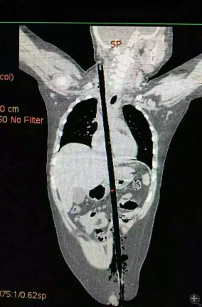 市兒童醫(yī)院組織專家團(tuán)隊(duì)對(duì)孩子的病情進(jìn)行檢查、評(píng)估后發(fā)現(xiàn),竹棍由患兒左側(cè)大腿根部插入,經(jīng)腹腔穿透胃、肝臟、膈肌入胸腔,并穿透患兒心臟,經(jīng)胸腔入頸部,此刻不能拔除竹棍,因?yàn)槿コ窆鲿?huì)導(dǎo)致心臟、肝臟破裂大出血導(dǎo)致休克,危及性命。
