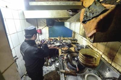 餐館后廚油膩垃圾遍布灶臺(tái),工作人員正在拍照取證。京華時(shí)報(bào)記者趙思衡攝