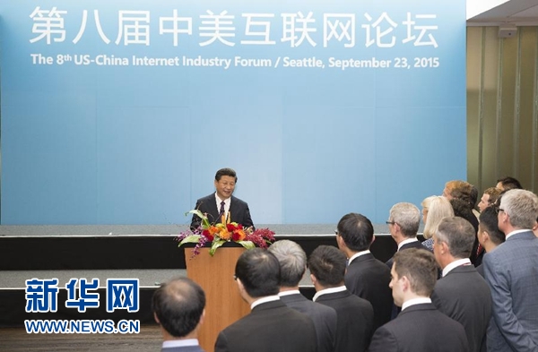 2015年9月23日,國家主席習(xí)近平在西雅圖微軟公司總部會見出席中美互聯(lián)網(wǎng)論壇雙方主要代表并發(fā)表講話。 新華社記者 黃敬文 攝