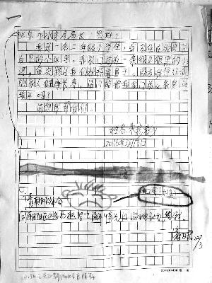 朱彥澎小朋友給北京市水務(wù)局局長的信里寫道:“我家住在駝房營南里的小區(qū)里,我家門前有一條很臭很黑的小河,每次路過我們都捂著鼻子。我想讓我的家人健康長壽,請問能把我家門前的臭河填平嗎?請您幫幫我們。”信紙上還用彩筆畫了一條河和一個(gè)小孩子癟著嘴巴的臉,配上“臺詞”——“!好臭!”