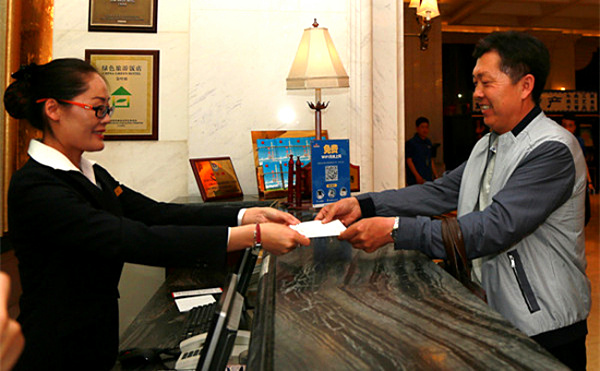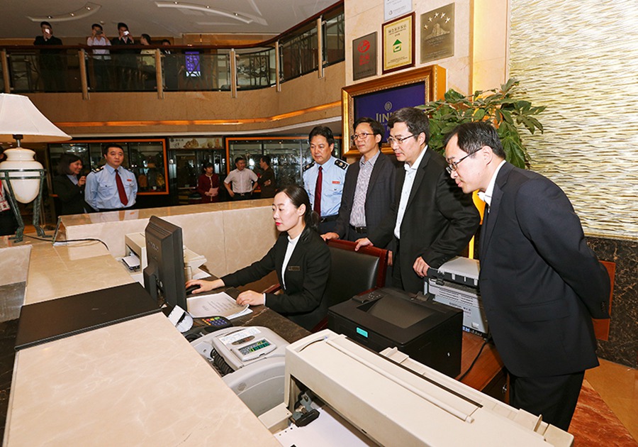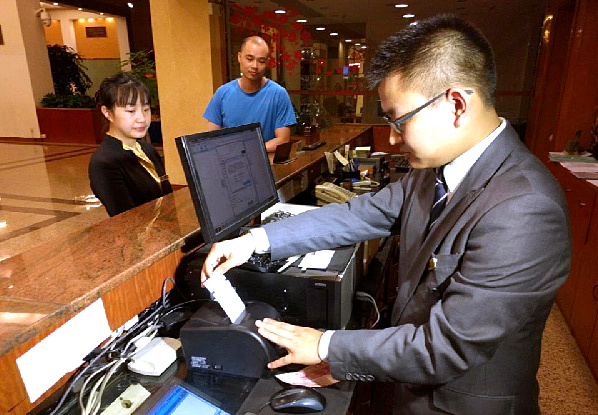 【全國(guó)首張】4月30日24時(shí)許,陳生(左)在北京民族飯店填寫(xiě)增值稅發(fā)票客戶信息表。5月1日,營(yíng)業(yè)稅改征增值稅改革在全國(guó)推開(kāi)。當(dāng)天零點(diǎn)一過(guò),正在北京民族飯店結(jié)賬的溫州商人陳生接過(guò)了飯店開(kāi)出的第一張?jiān)鲋刀悓S冒l(fā)票,令他驚喜的是這張發(fā)票也是營(yíng)改增試點(diǎn)全面推開(kāi)后全國(guó)首張?jiān)鲋刀惏l(fā)票。