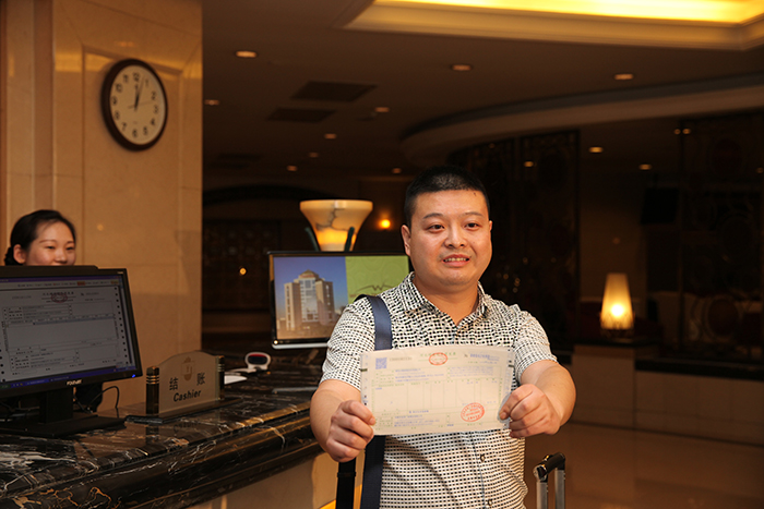【福建】5月1日,住客謝平在展示由福州大飯店開(kāi)出的營(yíng)改增試點(diǎn)全面推開(kāi)后福建省首張?jiān)鲋刀惏l(fā)票。