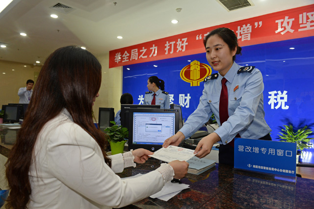 【廣西】5月1日,在廣西柳州市融安縣國(guó)稅局辦稅大廳,工作人員為納稅人辦理增值稅普通發(fā)票領(lǐng)用業(yè)務(wù)。當(dāng)日,營(yíng)業(yè)稅改征增值稅改革在全國(guó)推開(kāi)。
