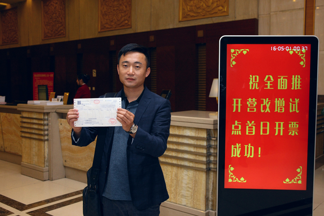 【寧夏】5月1日零點(diǎn)剛過(guò),在寧夏自治區(qū)財(cái)政廳、國(guó)稅局、地稅局相關(guān)人員的見(jiàn)證下,銀川國(guó)貿(mào)中心假日酒店財(cái)務(wù)總監(jiān)楊明拿到了寧夏自治區(qū)營(yíng)改增試點(diǎn)開(kāi)出的第一張?jiān)鲋刀惏l(fā)票。