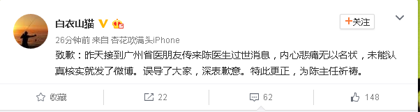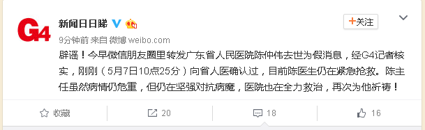 今天上午,有網(wǎng)友在微博爆出陳仲偉主任因搶救無(wú)效死亡的消息。但經(jīng)核實(shí),截止今天上午10點(diǎn)25分,陳仲偉依然還在搶救。此前發(fā)布該消息的網(wǎng)友也在微博中道歉,表示:“未能認(rèn)真核實(shí)就發(fā)了微博。誤導(dǎo)了大家!