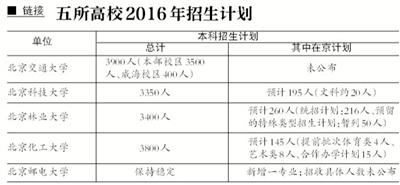 目前,除上述5所高校公布2016年招生計劃外,在京部屬高校中,已有10余所高!巴嘎丁绷私衲甑恼猩媱。新京報記者發(fā)現(xiàn),絕大多數(shù)在京招生計劃與去年持平。