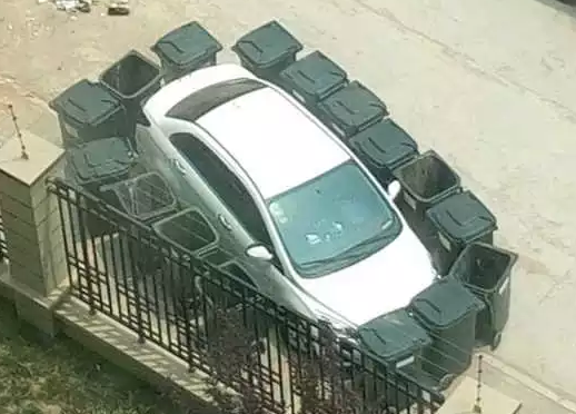 青島一私家車“搶地盤” 被16個(gè)垃圾桶包圍