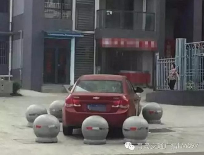 2016年6月,武漢一輛紅色雪弗蘭轎車的前后方被幾個(gè)大石墩圍住,該車主的停車位置靠近地下車庫出口,是消防通道,不能停車。此前物業(yè)曾多次勸阻和警告其不能在此停車,他卻并不聽勸,只能出此“下策”。
