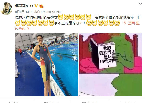 北京時間8月18日,洪荒少女傅園慧的偶像是誰?我們可以從她微博中看出來,至少其中之一是跳高選手張國偉;貒暮榛纳倥汀澳嗍鳌苯裉煸谖⒉┥匣恿!