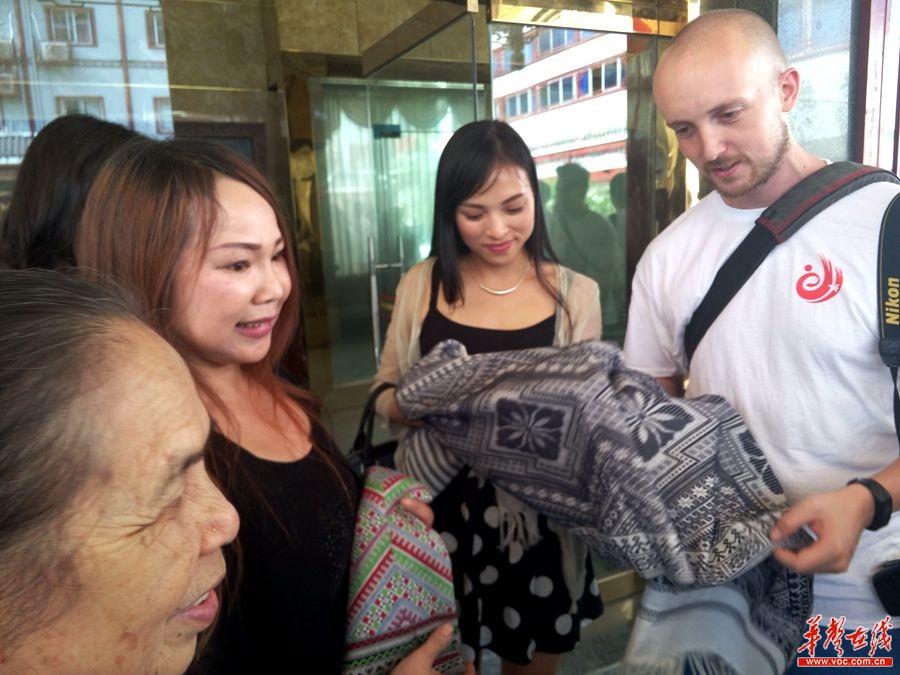 歐瑞凡(左二)向采訪團(tuán)記者介紹侗錦。記者 龍騰 攝