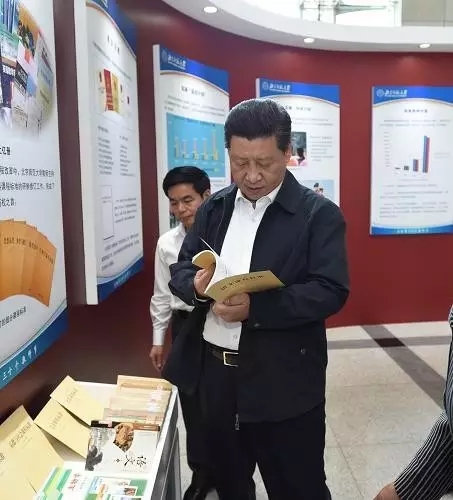 2014年9月9日,習(xí)近平在北師大考察,從展臺上拿起一本課標書翻看。新華社記者馬占成攝