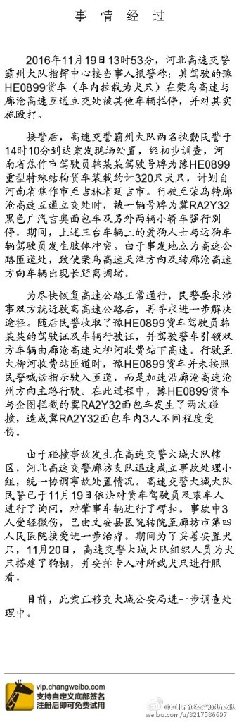 中新網(wǎng)11月21日電 據(jù)河北高速交警總隊(duì)廊坊支隊(duì)官方微博消息,11月19日,高速交警廊坊支隊(duì)轄區(qū)發(fā)生一起愛狗人士駕駛車輛攔停拉運(yùn)犬只車輛的事件。拉運(yùn)犬只車輛在榮烏高速與廊滄高速互通立交處被其它車輛攔停,造成擁堵。為避免擁堵,民警到場處置后,引領(lǐng)涉事車輛由廊滄高速大柳河收費(fèi)站下高速,行駛至大柳河收費(fèi)站匝道時,拉運(yùn)犬只車輛并未按交警喊話要求駛?cè)朐训,而是加速沿廊滄高速滄州方向主路行駛。在此過程中,該貨車與企圖攔截的面包車發(fā)生了兩次碰撞,造成面包車內(nèi)的三人不同程度受傷。隨后,警方依法對貨車駕駛?cè)思俺塑嚾诉M(jìn)行詢問,并對涉事車輛進(jìn)行暫扣。