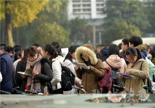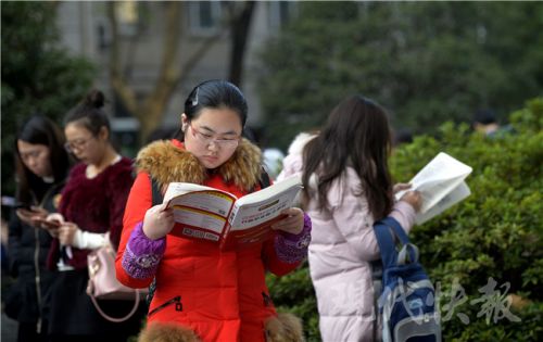 考生們進(jìn)場前還要“抱下佛腳”,不過考題的知識點(diǎn)跨度很大。新華報(bào)業(yè)視覺中心記者 邵丹 攝 2017國家公務(wù)員招錄筆試已正式開考,昨天是國考行測和申論考試的“大日子”,共有64124名考生選擇了江蘇考區(qū)參加國考。