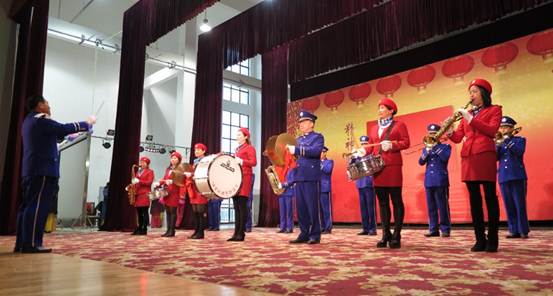 村里的銅管樂隊演奏起了《沒有共產(chǎn)黨就沒有新中國》、《走向復(fù)興》等組曲,樂手們個個精神抖擻。54歲的中音薩克斯手王維嘉是鎮(zhèn)政府的工作人員,6年前開始加入樂隊:“那個時候我什么都不懂,村里花錢請了老師來教,現(xiàn)在每周二都在文化禮堂練習(xí),也能演奏不少曲目了!
