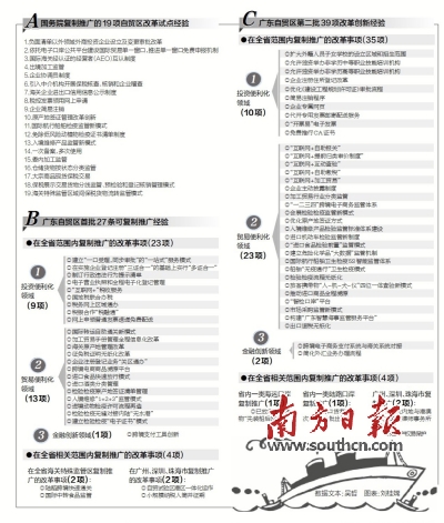 前不久,國務(wù)院印發(fā)了《關(guān)于做好自由貿(mào)易試驗區(qū)新一批改革試點經(jīng)驗復(fù)制推廣工作的通知》,決定在全國范圍復(fù)制推廣上海、天津、廣東、福建等4個自貿(mào)試驗區(qū)的19項改革試點經(jīng)驗。而此前,廣東省政府已分兩批在全省及相關(guān)范圍內(nèi)復(fù)制推廣了66項廣東自貿(mào)區(qū)的改革創(chuàng)新經(jīng)驗。