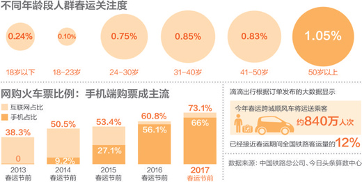 最關注春運的是什么人?按照鐵總與今日頭條聯(lián)合發(fā)布的數據報告,50歲以上人群相較其他年齡段更關注春運。這個結果與社會的普遍印象不同,人們似乎更傾向于認為,外出的求學者和就業(yè)者是形成春運的主要成因,而50歲以上人群顯然不是這兩個人群的主力。