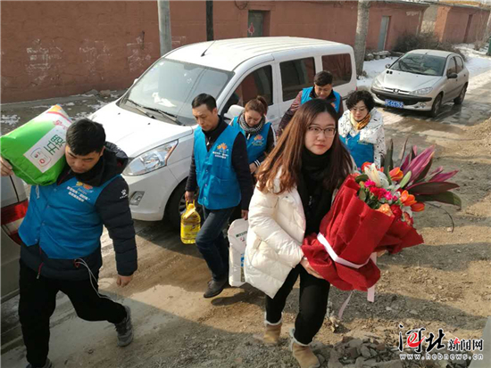 1月24日,秦皇島市文苑百鑫辦公用品志愿服務隊的志愿者們來到抗戰(zhàn)老兵徐山家中為向老人拜年,為老人送上米面油等慰問品和慰問金,祝老人新年快樂。記者宋柏松攝
