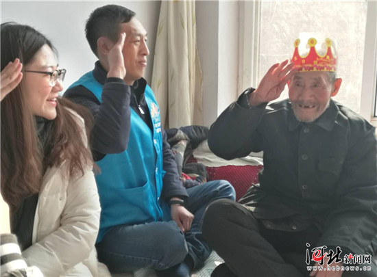 1月24日,秦皇島市志愿服務隊來到抗戰(zhàn)老兵徐山家中進行慰問,并為老人慶祝生日。圖為徐山老人高興的向大家敬起了軍禮。記者宋柏松攝