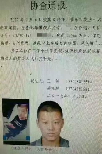 東北網(wǎng)2月6日訊(記者 雷蕾)2月6日0時許,肇東市發(fā)生一起命案,犯罪嫌疑人李某在逃中。當(dāng)?shù)鼐浇裉彀l(fā)布協(xié)查通報,對提供線索抓獲犯罪嫌疑人的獎勵人民幣五千元。