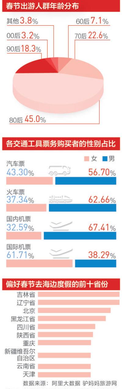 通過大數據觀察,春節(jié)游客的組成和出行人數正發(fā)生變化。在攜程上,80%以上預訂游客以家庭為單位。旅游專家分析,這說明家庭旅游的趨勢越來越明顯。在中國社會老齡化趨勢、二孩放開的背景下,家庭旅游市場會不斷擴大。
