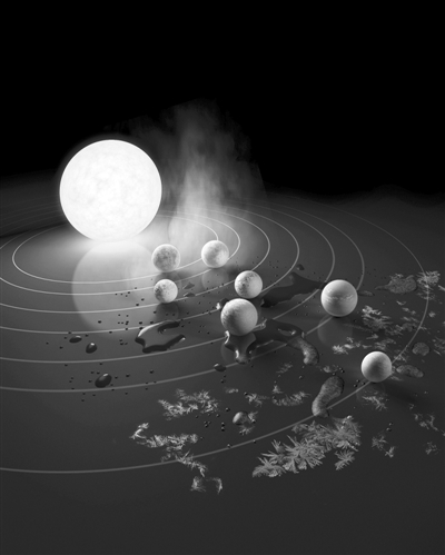 利用斯皮策觀測(cè)到的數(shù)據(jù),團(tuán)隊(duì)精確測(cè)量了7顆行星的大小——質(zhì)量最小的約為0.4個(gè)地球,最大的約為1.4個(gè)地球;團(tuán)隊(duì)還首次估計(jì)了其中6顆的質(zhì)量,并認(rèn)為它們都可能是巖態(tài)行星,但最外側(cè)的第7顆行星質(zhì)量還沒估算出來,科學(xué)家認(rèn)為,它可能是個(gè)冰冷的雪球狀世界。