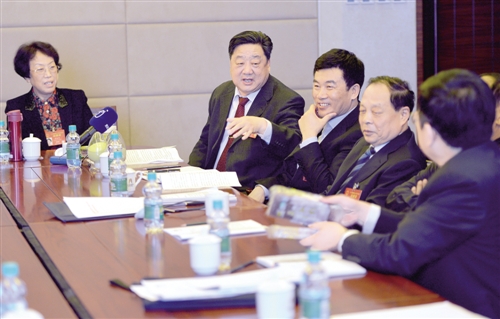 3月5日下午,人大黑龍江代表團(tuán)在駐地分組審議政府工作報(bào)告。付華廷代表(左二)在發(fā)言時(shí)說(shuō):“政府工作報(bào)告體現(xiàn)了以人為本、執(zhí)政為民的思想,催人奮進(jìn)!北緢(bào)記者 李景錄攝