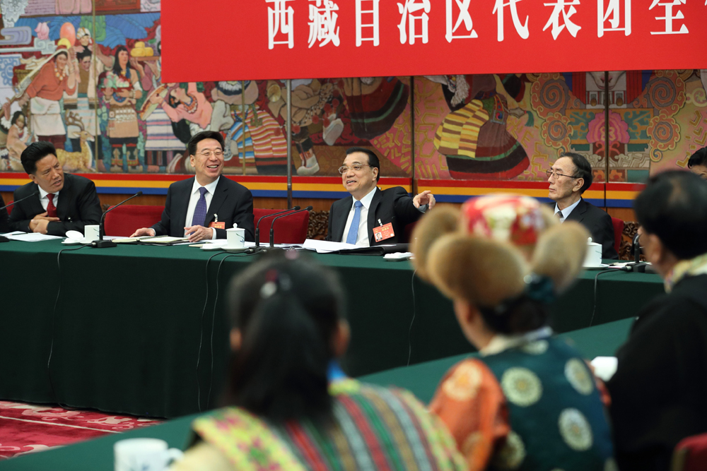 國際在線消息(記者 翟磊):李克強總理7日上午來到十二屆全國人大五次會議西藏代表團,參加審議政府工作報告。五位藏族、珞巴族、門巴族代表向總理獻上潔白的哈達。 -