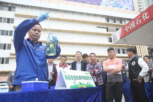 “您可以對(duì)比一下,油品摻入水雜,右邊使用除水濾芯后加注出的油樣照樣純凈透亮無(wú)雜質(zhì),而左邊的是用一般濾芯加注出的品樣,早已渾濁不堪!爆F(xiàn)場(chǎng)解說(shuō)員候賢武向顧客耐心地演示著除水濾芯的神奇功效。演示過(guò)程中,現(xiàn)場(chǎng)使用模擬加油機(jī)加出注入大量的水油品,普通濾芯直接將含水油品加出來(lái),流速不減,加油槍仍然正常工作。但是安裝了除水濾芯的加油機(jī),遇到這種情況加油速度明顯變慢,直至濾芯內(nèi)遇水膨脹的材料完全將濾清器堵死,導(dǎo)致加油槍完全加不出油,以此向加油員發(fā)出警示:油品含水。這樣達(dá)到兩個(gè)目的,一是保證含水油不進(jìn)入消費(fèi)者油箱,二是萬(wàn)一加油站油罐含水,或者是設(shè)備設(shè)施的原因突然破壞性進(jìn)水,除水濾芯的反應(yīng)可以向加油站工作人員發(fā)出警報(bào)。目前,深圳石油所有加油站均安裝了能夠有效去除油品中的雜質(zhì)和隔離油品水份的高精度除水紙濾芯,確保清潔的油品加到消費(fèi)者的油箱,減少汽車發(fā)動(dòng)機(jī)的磨損,延長(zhǎng)車輛的使用壽命。該公司通過(guò)科技創(chuàng)新的方法把好了油品的最后一道關(guān),真正使消費(fèi)者用得安全、安心。