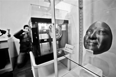 昨天下午,北京青年報記者來到3D打印工作室,發(fā)現(xiàn)里頭并沒有想象中的復(fù)雜,15平方米左右的工作間內(nèi),東側(cè)一排桌子上放著兩臺電腦,與南側(cè)靠墻位置的一臺3D打印機相連,西側(cè)放著1個陳列柜,里頭陳列著十來個大小不一的成品,有的是剛剛打印出來的模子,有的則貼上了硅膠并畫上妝容。個別成品乍一看還真以為是一張“人臉”。