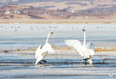 放眼望去,偌大的濕地水岸相依,沼澤遍布,龐大的天鵝群點綴數(shù)公里,尤其在水面寬闊處,成群的天鵝相擁相簇,或悠閑漂游,或嬉戲覓食,“嘎嘎”的叫聲宛若大自然天籟之音的合奏(圖③,張衛(wèi)東攝)。
