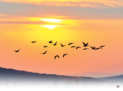 綠草雖然還沒冒頭,上萬只大雁卻已尋覓著春天的氣息來到這里棲息和覓食;蚴桥懦梢恍,或是形成“人”字,或是成片成群漫天飛舞(圖⑥,資料圖片)……