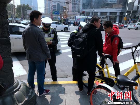 上海南京西路華山路路口,兩名交警對(duì)三名在機(jī)動(dòng)車(chē)道騎行共享單車(chē)的人員進(jìn)行處罰!⊥踝訚z
