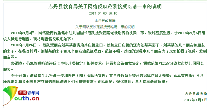 中國青年網(wǎng)北京4月9日電(見習記者 劉利影)日前一則“延安志丹縣侯市鄉(xiāng)幼兒園園長酒桌不雅視頻”在網(wǎng)上傳播。4月8日下午,志丹縣教育局在官網(wǎng)發(fā)布通報稱,針對網(wǎng)絡(luò)微博傳播候市幼兒園園長范凱接受蔬菜老板吃請拍視頻一事,經(jīng)調(diào)查,范凱接受吃請違反《中央八項規(guī)定》相關(guān)要求,解聘范凱同志雙河鎮(zhèn)候市幼兒園園長職務(wù)。